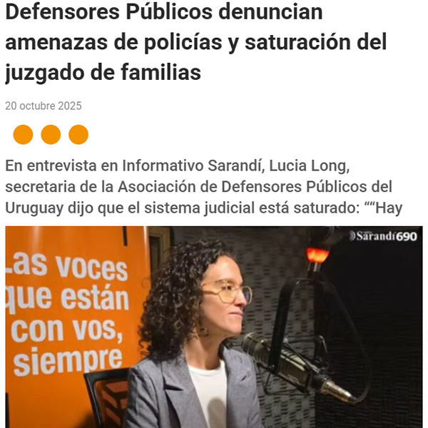 El lunes 20 de octubre de 2025, la Dra. Lucía Long brindó una entrevista al Informativo Sarandí, donde comentó los avances legislativos vinculados a la Defensa Pública y la reciente media sanción obtenida.