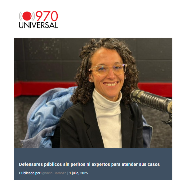 01/07/25 – La Dra. Lucía Long, participó en la radio 970 Universal, en el programa “Punto de encuentro”. En la entrevista abordó la situación actual de la defensa pública y el trabajo de las defensoras y defensores del país. Para acceder a la nota: https://970universal.com/2025/07/01/defensores-publicos-sin-peritos-ni-expertos-para-atender-sus-casos/ 25 septiembre, 2025 Noticias 2